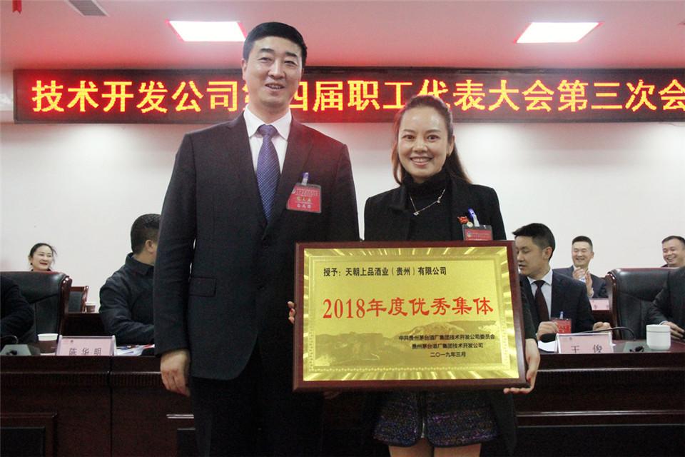 茅台集团公司总经理助理、茅台技开公司党委书记、董事长杨凤祥在会上作《2018年工作报告》。茅台集团公司原总工程师吕云怀、茅台集团公司原工会主席罗双全、茅台集团公司原副总会计师张毅出席会议。会议由茅台技开公司党委副书记、总经理王俊主持。仁怀市总工会组宣部部长饶华、茅台集团公司工会艺术团团长李小春应邀出席会议。茅台技开公司领导班子成员陈华明、杨盛勇、屈午、陈涛、刘再智、陈林出席会议。来自控股公司、公司各部门(车间)108名正式代表、40 名列席代表及退休职工代表参加会议。本次会议隆重表彰了2018年先进集体、2018年优秀及先进员工。 天朝上品酒业继2017年再度蝉联,获茅台技开公司唯一“2018年度优秀集体”荣誉,天朝上品酒业6名员工分获优秀员工和先进员工荣誉。